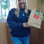 Mandamos a realizar a nuestros talleres de Brasil portacosméticos confeccionados con material de descarte, y se les sublimó la imagen de la flor del Ceibo, que es la flor nacional Argentina y representa la belleza, la fuerza, la resistencia y el amor. Adentro se encontraron con la sorpresa de un shampoo y un acondicionador sólido, sin químicos, hechos a base de flores naturales.