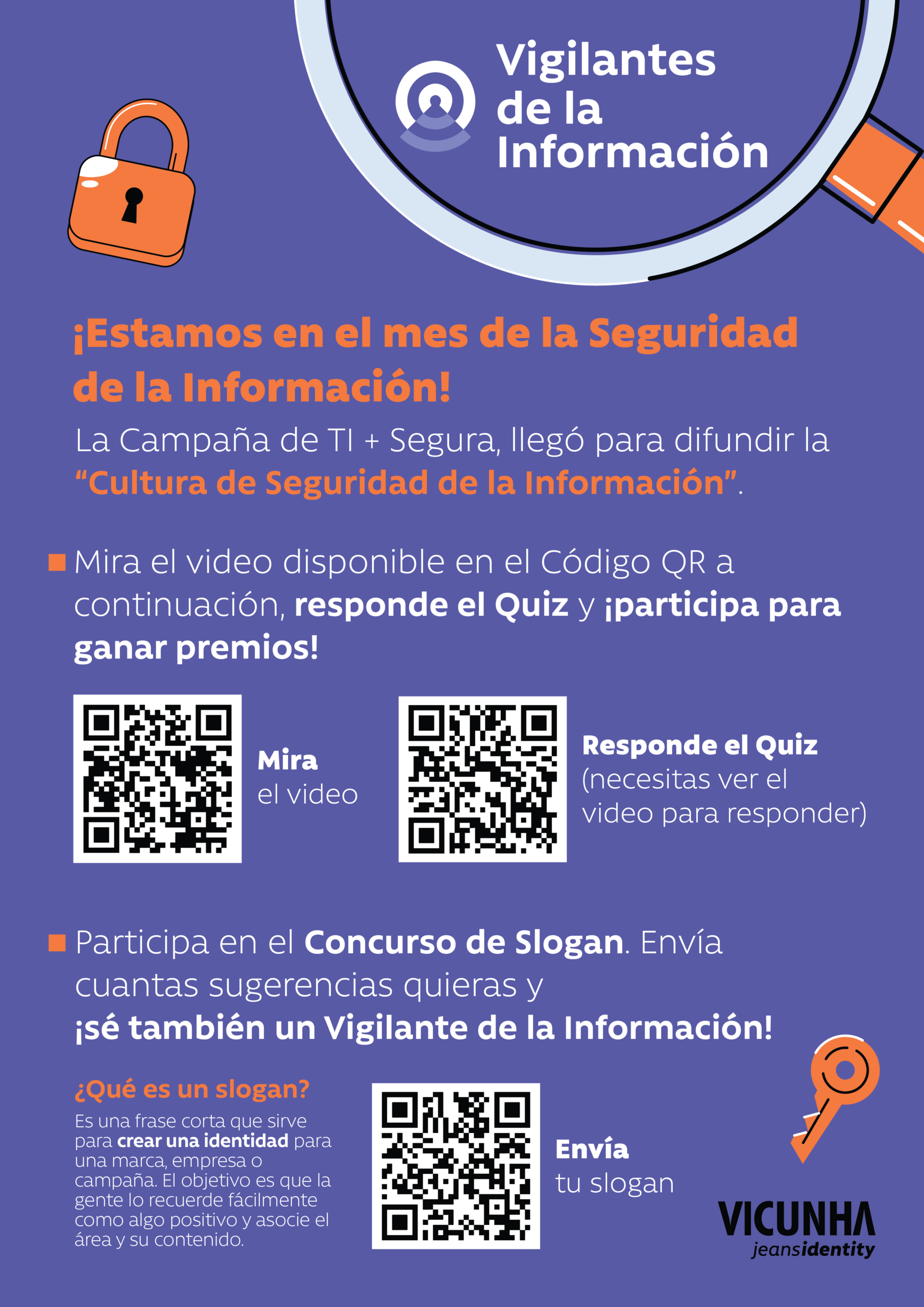 Para comenzar el mes, hemos preparado un QUIZ especial sobre la Política de Seguridad de la Información de Vicunha y un concurso al mejor SLOGAN sobre Vigilantes de la Información.