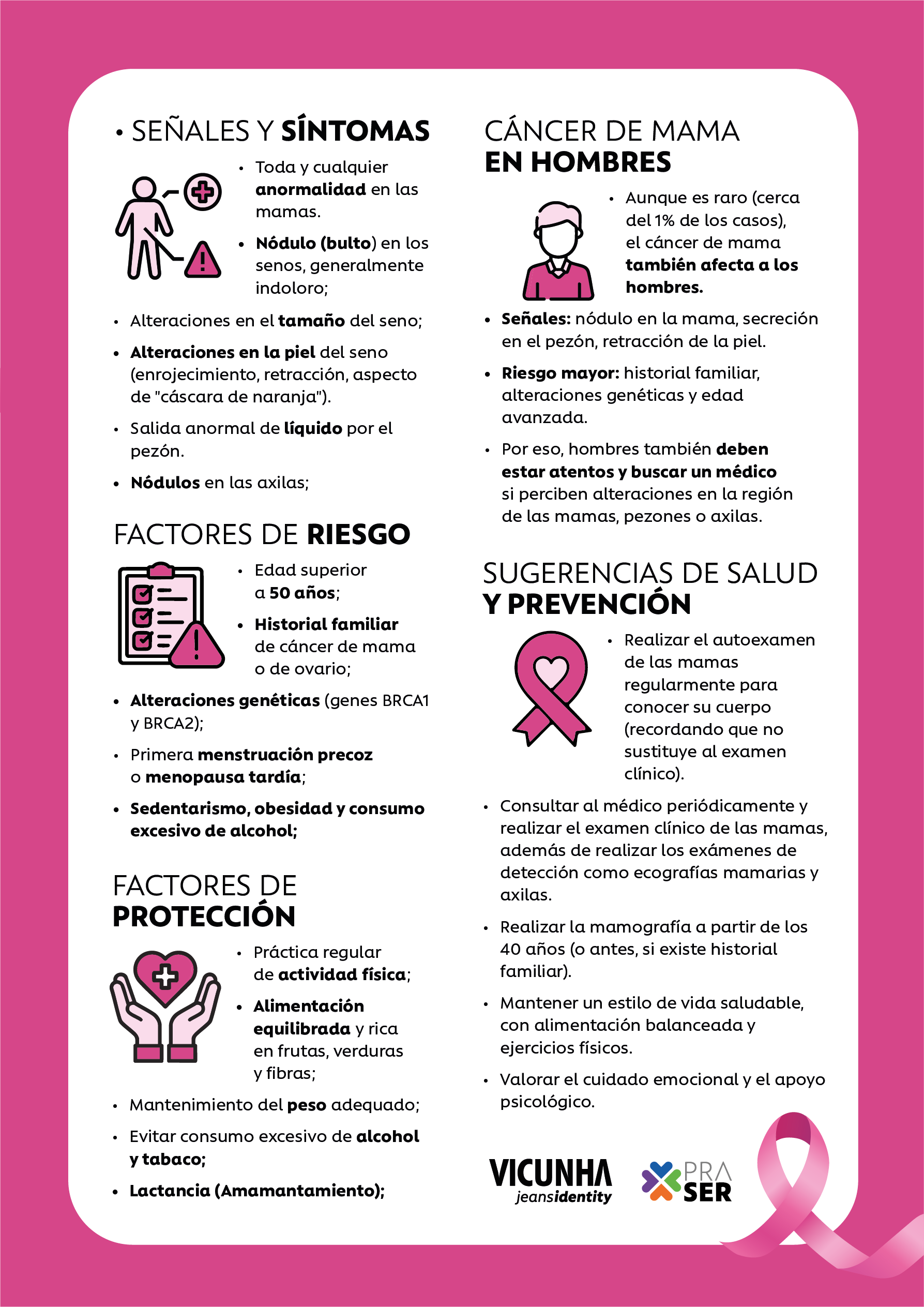 Vicunha participa anualmente en el Octubre Rosa con iniciativas de concienciación y cuidado de la salud de sus empleadas y familiares. La empresa promueve momentos de diálogo sobre el tema, difunde materiales informativos, fomenta la realización de exámenes preventivos y refuerza su compromiso con la salud y el bienestar de todos.