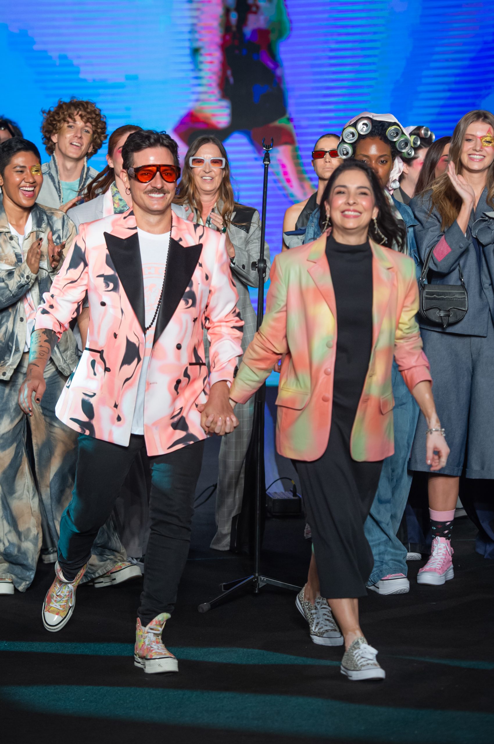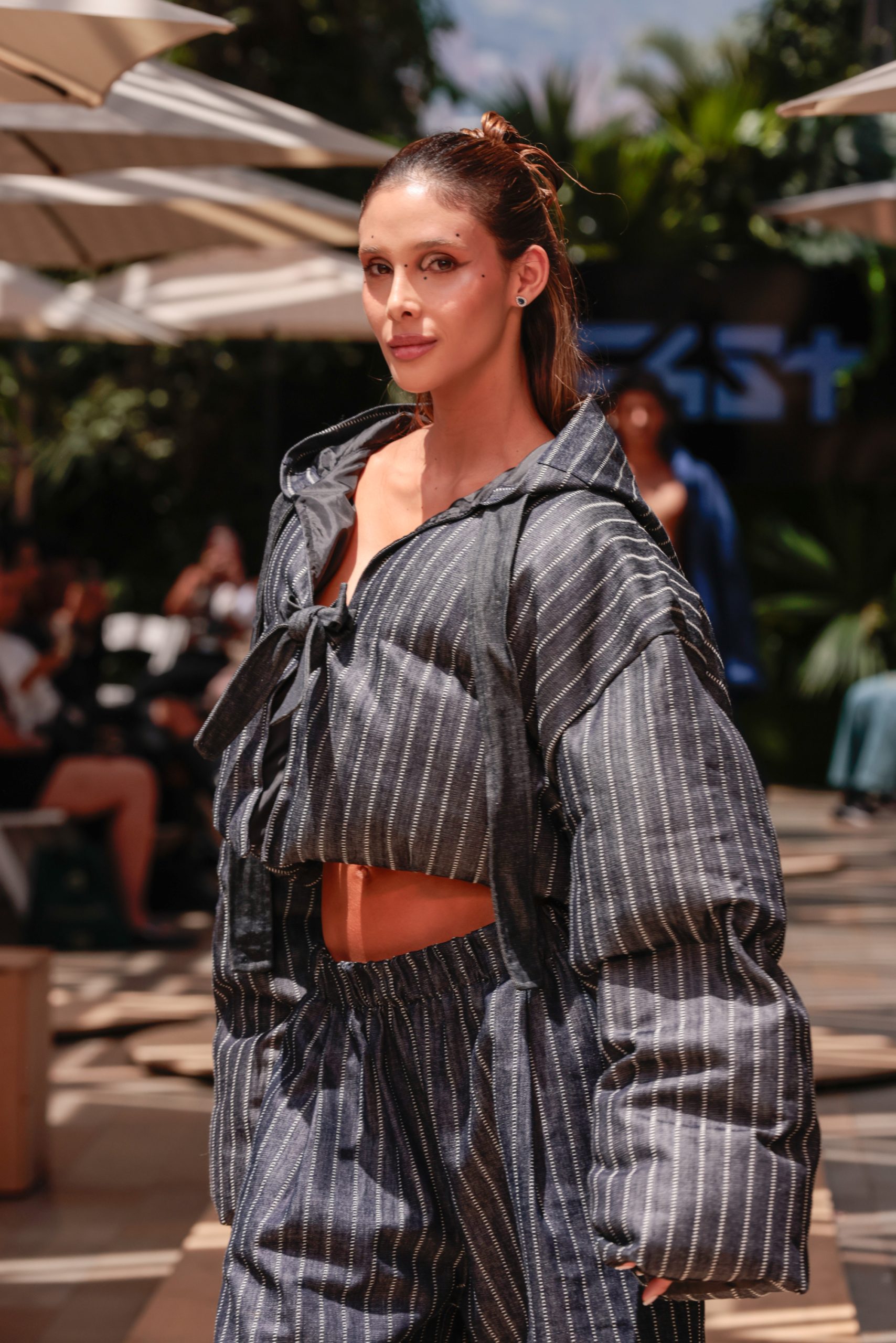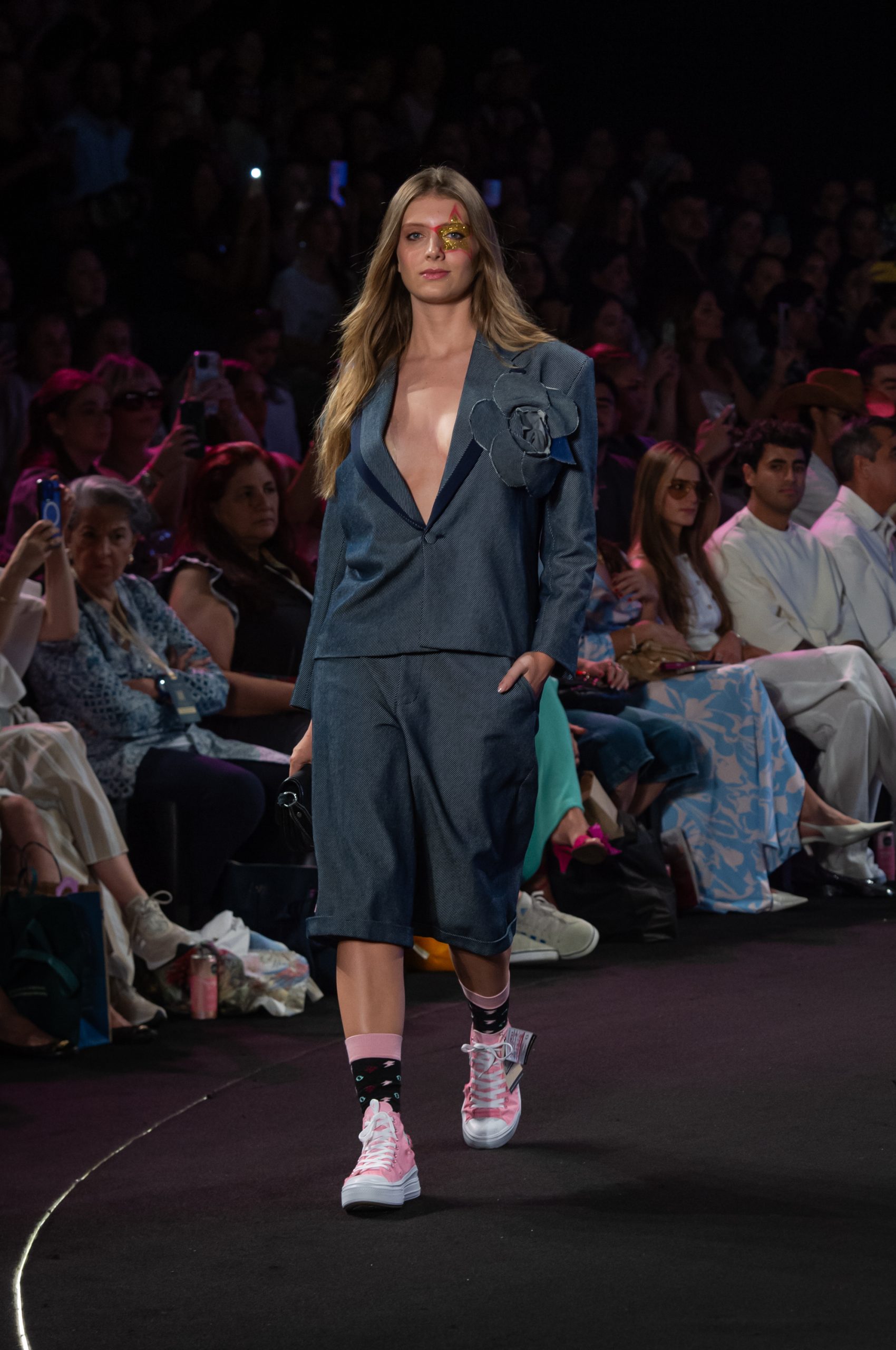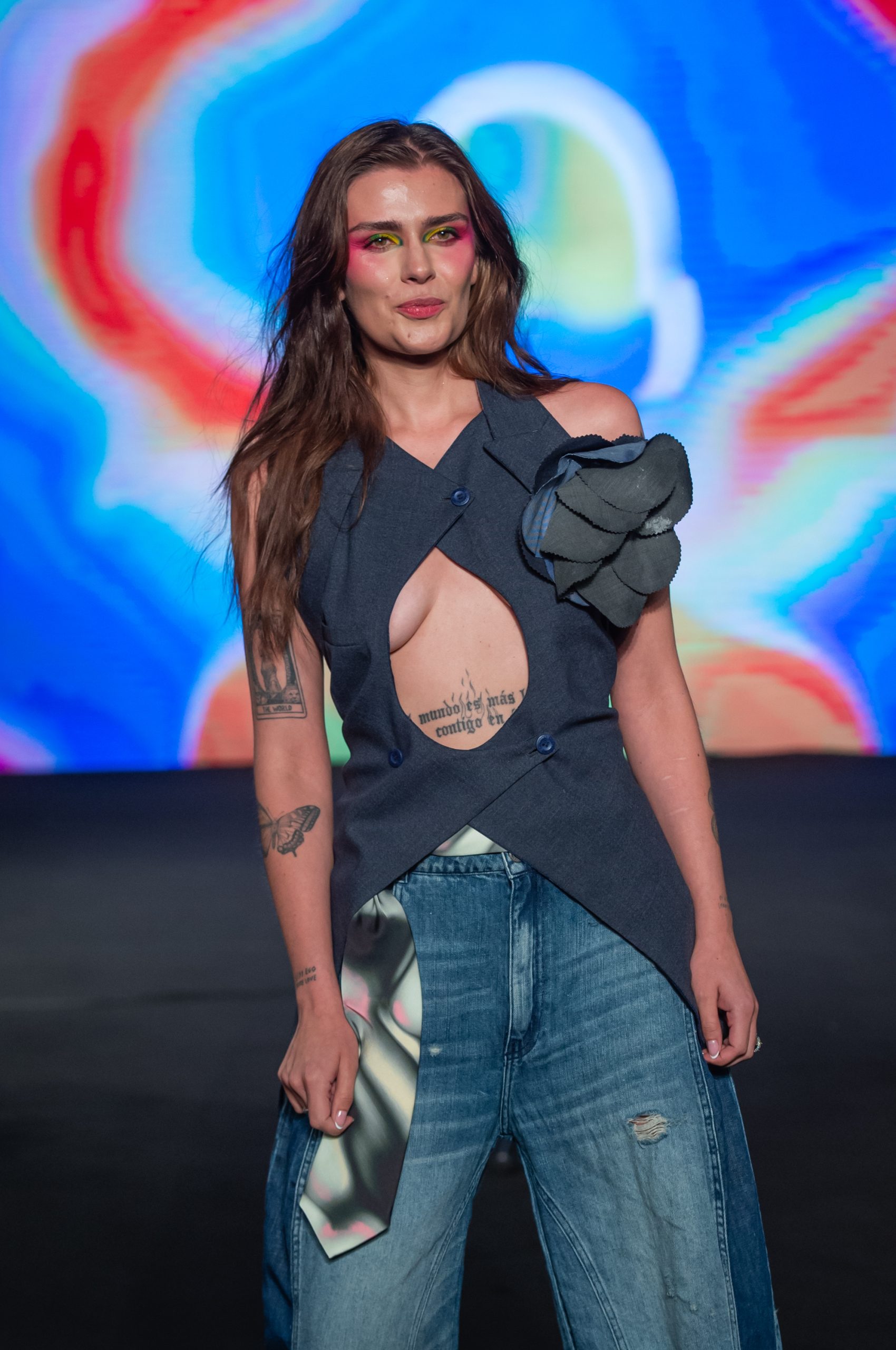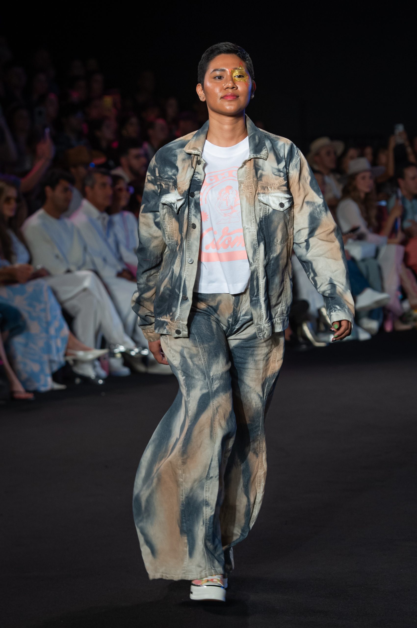 El diseñador Jorge Orozco, quien regresó al espacio que lo vio desfilar años atrás, esta vez transformado por una experiencia de vida que marcó su esencia: su proceso como paciente oncológico. Presentó su colección AURA una propuesta, llena de esperanza y simbolismo, que fusionó la sastrería clásica con la ligereza del denim de Vicunha, creando prendas que buscan hacer visible lo que a menudo se siente pero no se ve. Lo más conmovedor fue la participación de invitadas especiales: pacientes oncológicas que, con su fortaleza, modelaron la colección.